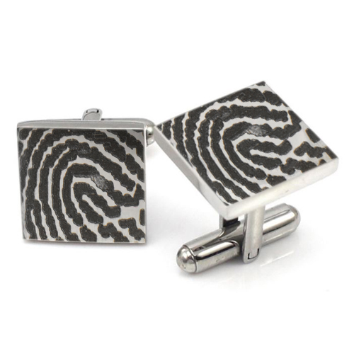 Strakke vierkante RVS manchetknopen inclusief het graveren van een vingerafdruk. Naast een vingerafdruk is het ook mogelijk om een geschaalde afdruk van een handpalm, dierenpootje of babyvoetje in de manchetknopen te laten graveren.