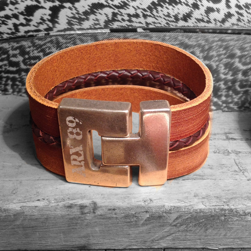 Lederen armband met een luxe magneetsluiting in de kleur bruin. De armband heeft in het midden een gevlochten lederen bandje en aan de buitenzijdes stoere bruine stroken van geborsteld leder. De armband is van het merk ARX89, welke ambachtelijk in Nederland wordt vervaardigd. De prijs is inclusief het graveren van maximaal 25 tekens op de magneetsluiting. Als graveerletter wordt hetzelfde lettertype als het ARX89 logo gebruikt. De tekst kunt u toevoegen in de vervolgstappen.