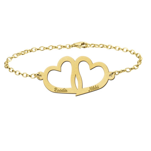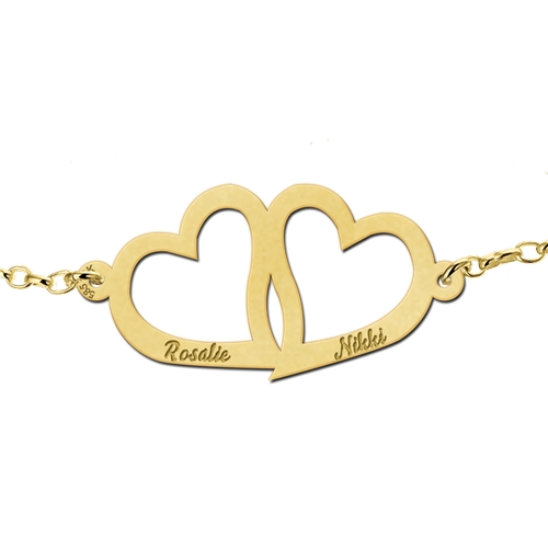 De schakelarmband is voorzien van een dubbel hart met namen. U kunt per hart een tekst door geven van maximaal 10 tekens.