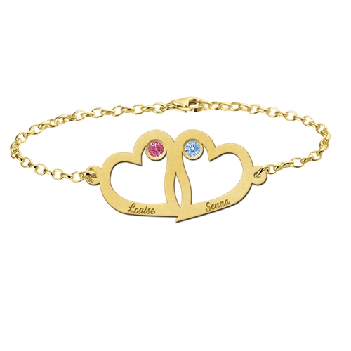 De schakelarmband is voorzien van een dubbel hart met namen en geboortestenen. U kunt per hart een tekst door geven van maximaal 10 tekens. U heeft de keuze uit 12 geboortestenen per hart.