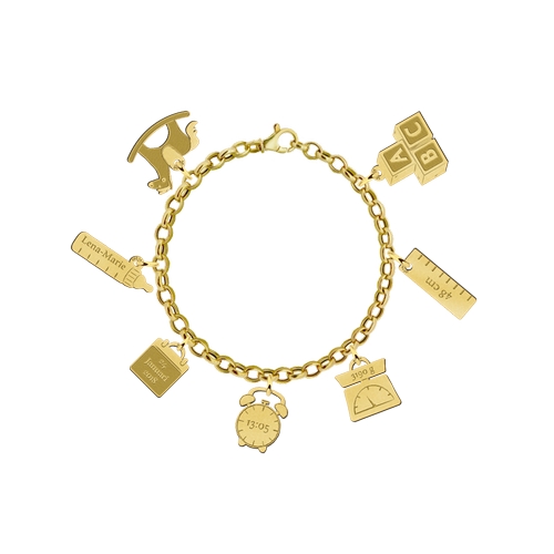 De 14k gouden schakelarmband is voorzien van zeven geboortebedels. Het hobbelpaard en de bouwblokken zijn ter decoratief, de andere bedels kunt u laten voorzien van een tekst om de armband nog persoonlijker te maken.