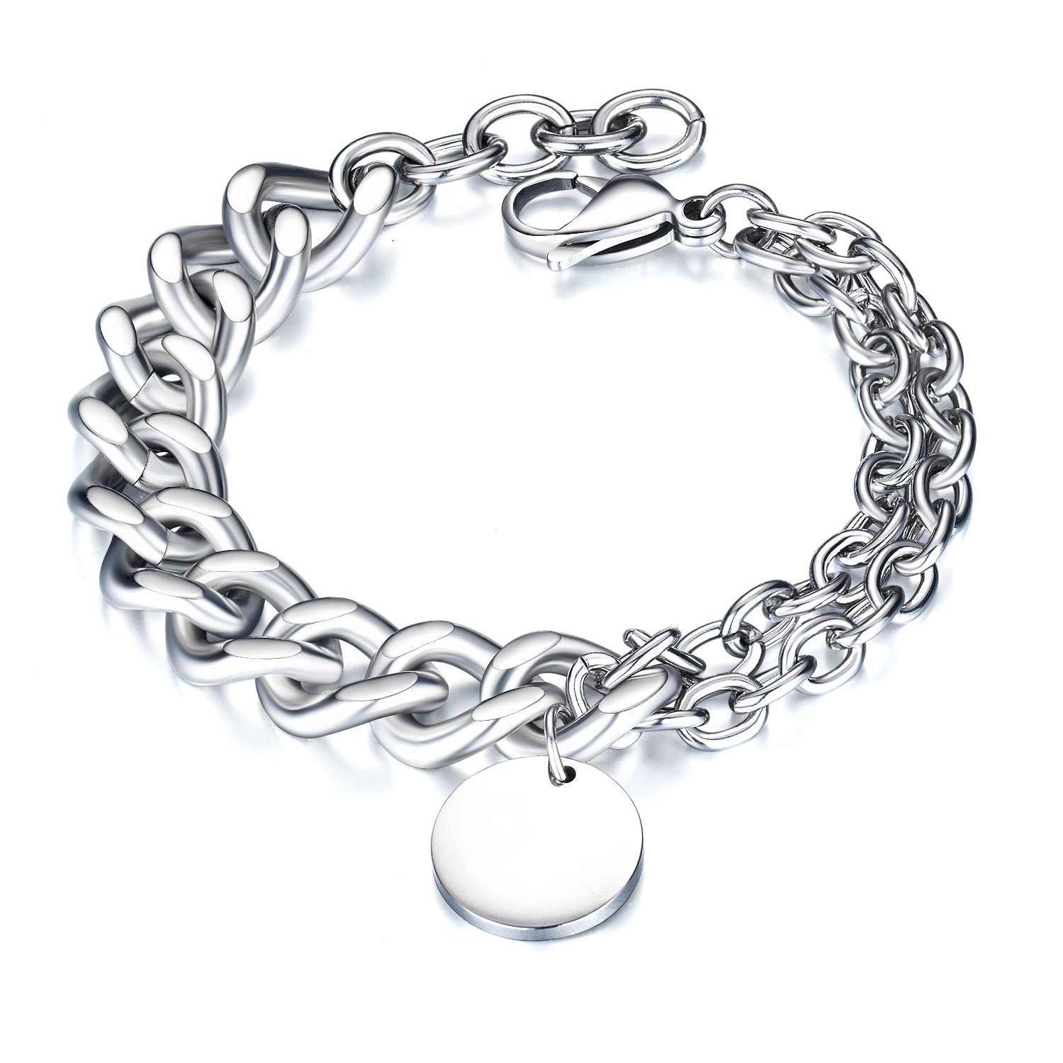 RVS armband met een enkele grove schakel van 1,2 cm en een dubbele smalle schakel 0,5 cm met ronde bedel van 1,8 cm.