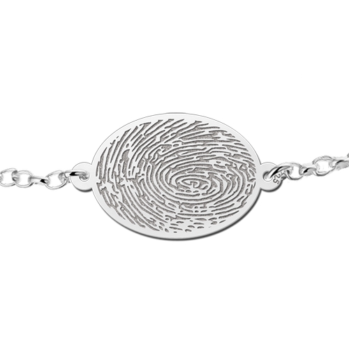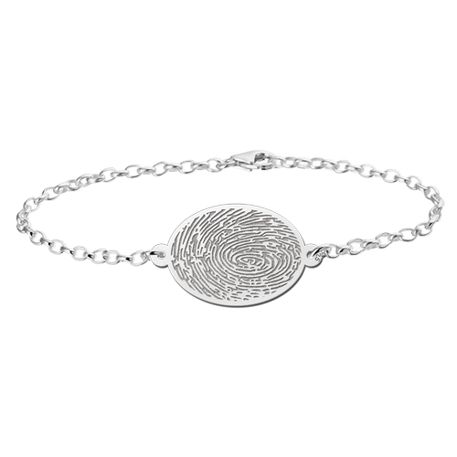 De armband is voorzien van een ovaal waarop een vingerafdruk gegraveerd wordt aan de voorzijde.