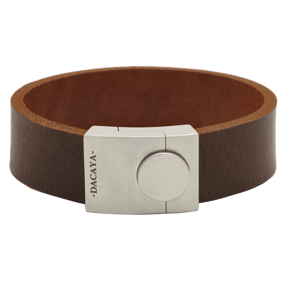 Stoere leren armband van het merk Dacaya met een stevige bruin-grijze leren band. Deze armband is 20mm breed. Het leer is soepel en plat afgewerkt waardoor de armband prettig draagt. De armband is voorzien van een degelijke RVS sluiting. De armband is verkrijgbaar in een lengtemaat naar keuze. De armband kan strak, middel of los gedragen worden. De polsmaat dient bij de knokkel gemeten te worden, houd hierbij rekening met de volgende richtlijn: