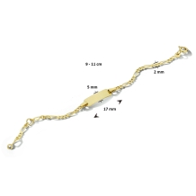 Deze graveerarmband met een plaat van 5x17mm is gemaakt van 9k geelgoud. De armband heeft een figaro schakel van 2mm. De graveerplaat heeft een dikte van 0.3mm en kan worden gegraveerd met een naam en/of datum. De naam en/of datum wordt in hoge kwaliteit in het graveerplaatje van de armband gegraveerd, u heeft hierbij de keuze uit een sierlijke schrijfletter of een standaard blokletter.