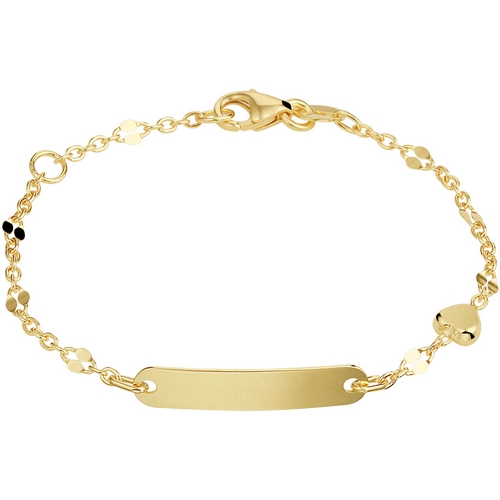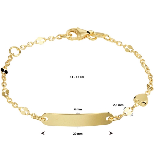 14k Geelgouden armband met een graveerplaat en een hartje. De graveerplaat heeft afmetingen van 4x20 mm en kan worden voorzien van een naam en/of datum op de voor- en/of achterzijde. U heeft hierbij de keuze tussen een sierletter of een standaard blokletter.