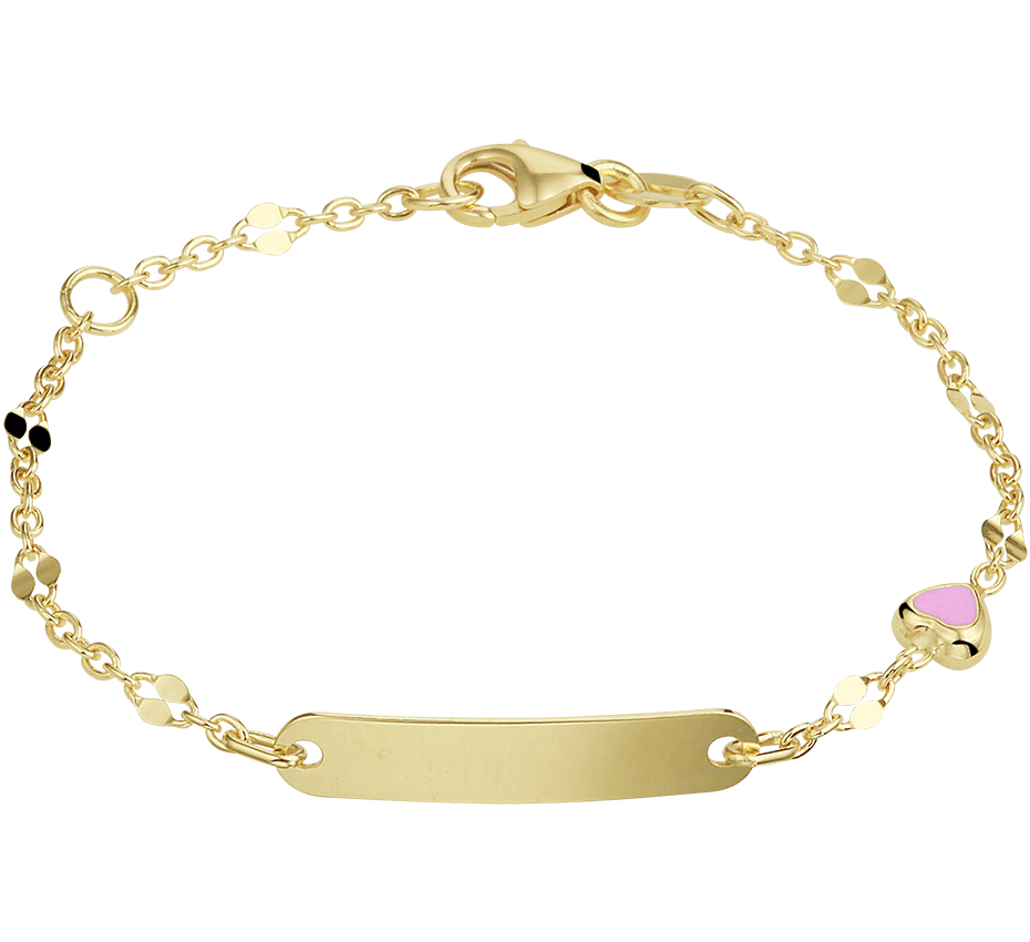 Gouden kinderarmbandje waarin de naam en/of datum gegraveerd wordt in het graveerplaatje. In het bandje zit een roze hartjesbedel. De naam en/of datum kan in een standaard letter of een sierlijke letter gegraveerd worden.
