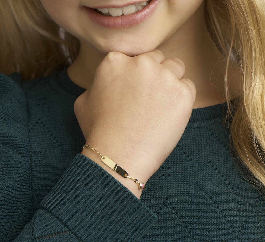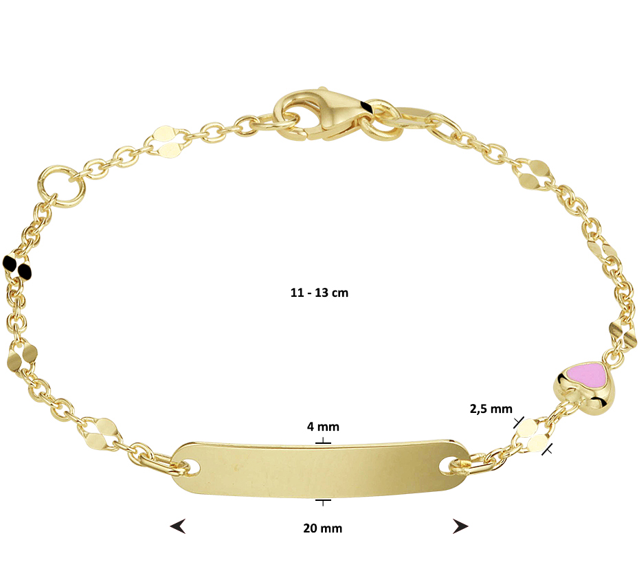 Het graveerplaatje is 4mm breed en 20mm lang. Het armbandje heeft een karabijnsluiting. Het armbandje van 14 karaats geelgoud is verkrijgbaar in de verstelbare lengte 11-13cm.