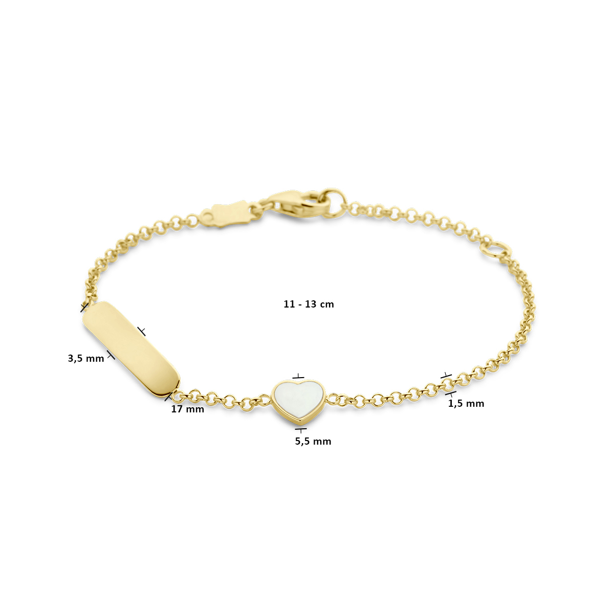 Dit gouden kinder armbandje van 14 karaats geelgoud is verkrijgbaar in de volgende verstelbare lengtes 9-11cm en 11-13cm en heeft een parelmoer hart.