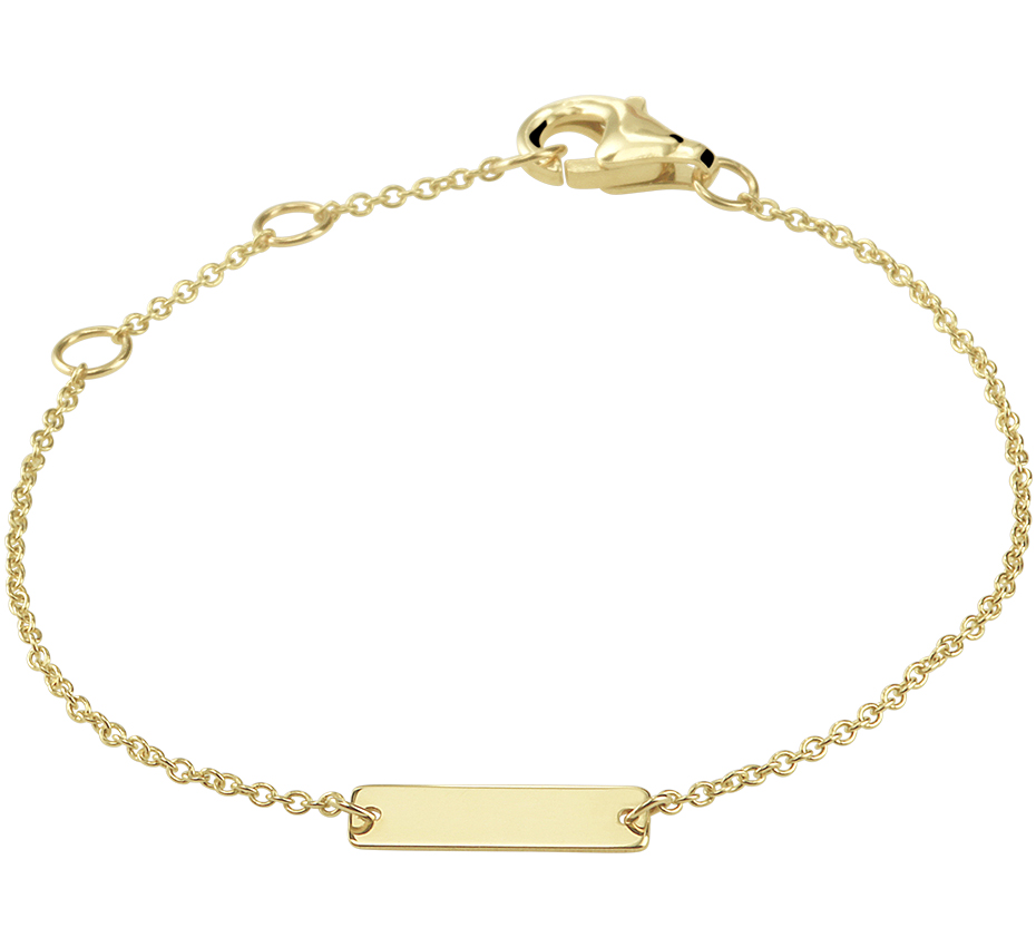 14K Gouden kinderarmbandje met een plaatje waarop een naam, datum of tekst van maximaal 8 tekens in hoge kwaliteit wordt gegraveerd. U heeft hierbij de keuze uit een sierlijke schrijfletter of een standaard blokletter en de voorkant en/of achterkant.