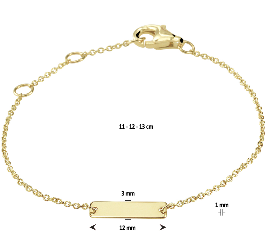 Het graveerplaatje is 12mm breed en 3mm hoog. Dit gouden kinder armbandje van 14 karaats geelgoud is verkrijgbaar in de verstelbare lengte 11,12 en 13cm.
