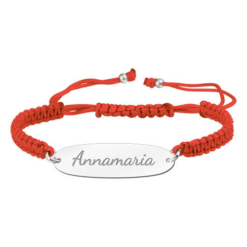 Rood kinderarmbandje met naam vervaardigd uit koord met een zilveren plaat. In de plaat van dit armbandje graveren we een naam van maximaal 12 tekens. De graveertekst voegt u eenvoudig toe in de vervolgstappen.