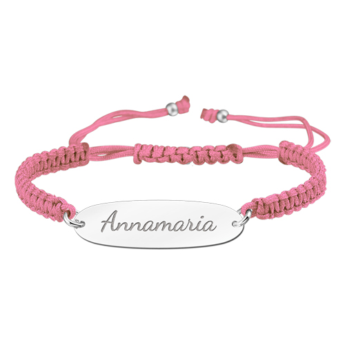 Roze kinderarmbandje met naam vervaardigd uit koord met een zilveren plaat. In de plaat van dit armbandje graveren we een naam van maximaal 12 tekens. De graveertekst voegt u eenvoudig toe in de vervolgstappen.