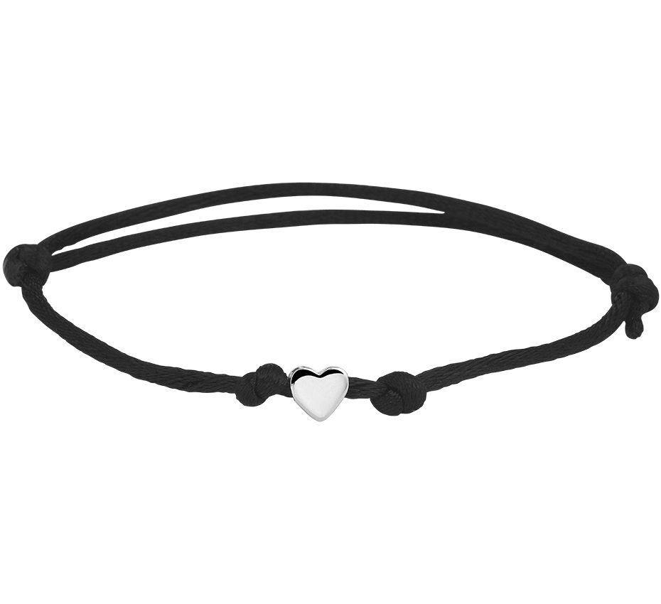 Zwart gevlochten armband met zilveren hartje waarin een initiaal gegraveerd kan worden. De gravure kan in een sierlijke schrijfletter of een standaard blokletter uitgevoerd worden.