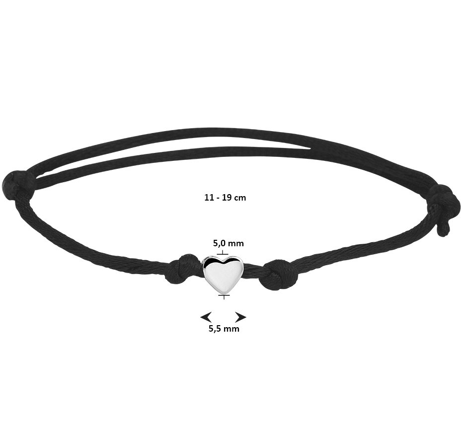 Het armbandje is uitgevoerd met een gerhodineerd 925 zilveren hartje. Het armbandje is verstelbaar en heeft draaglengte van 11-19 cm. De afmetingen van het hartje zijn 5x5.5 cm.