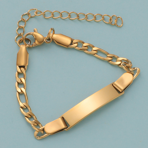 Dit stalen armbandje in prachtig hoogglans goudkleur is verstelbaar van 12 tot 15,5cm. De schakels hebben een hoogte van 0,4 cm. Het graveerplaatje kan aan de voor- en achterkant gegraveerd worden en heeft een afmeting van 2,5 x 0,55cm, er is ruimte voor maximaal 12 tekens, inclusief spaties. De naam en/of datum wordt in hoge kwaliteit in het graveerplaatje van de armband gegraveerd, u heeft hierbij de keuze uit een sierlijke schrijfletter of een standaard blokletter: