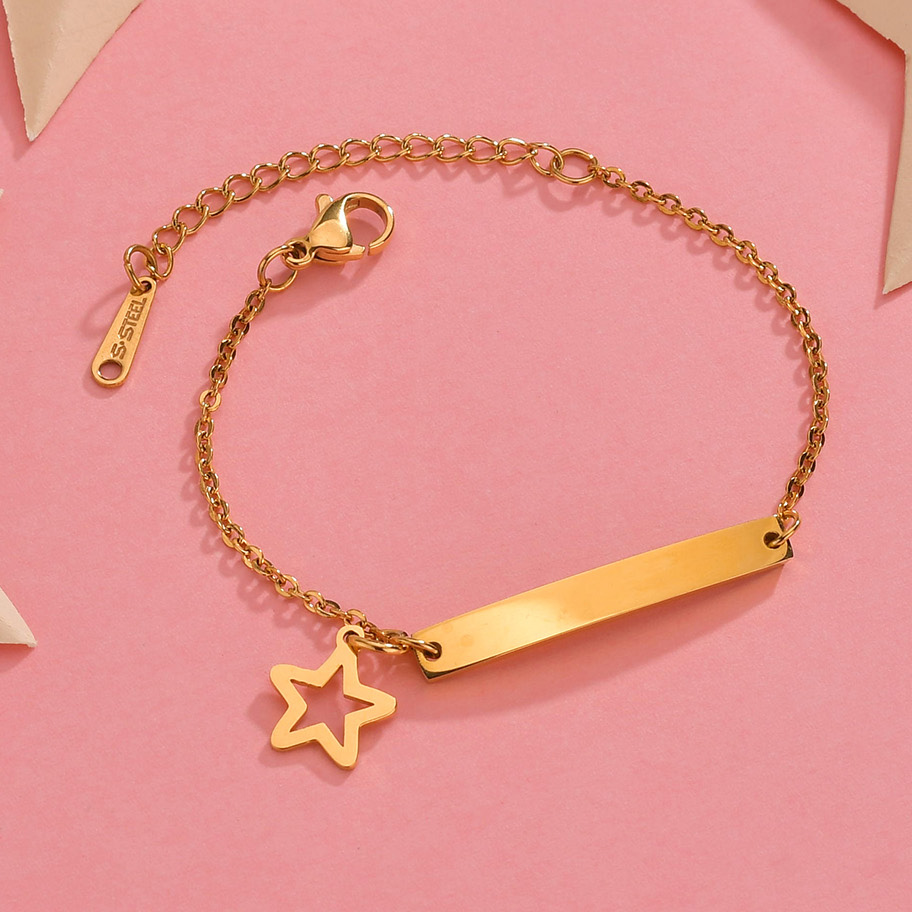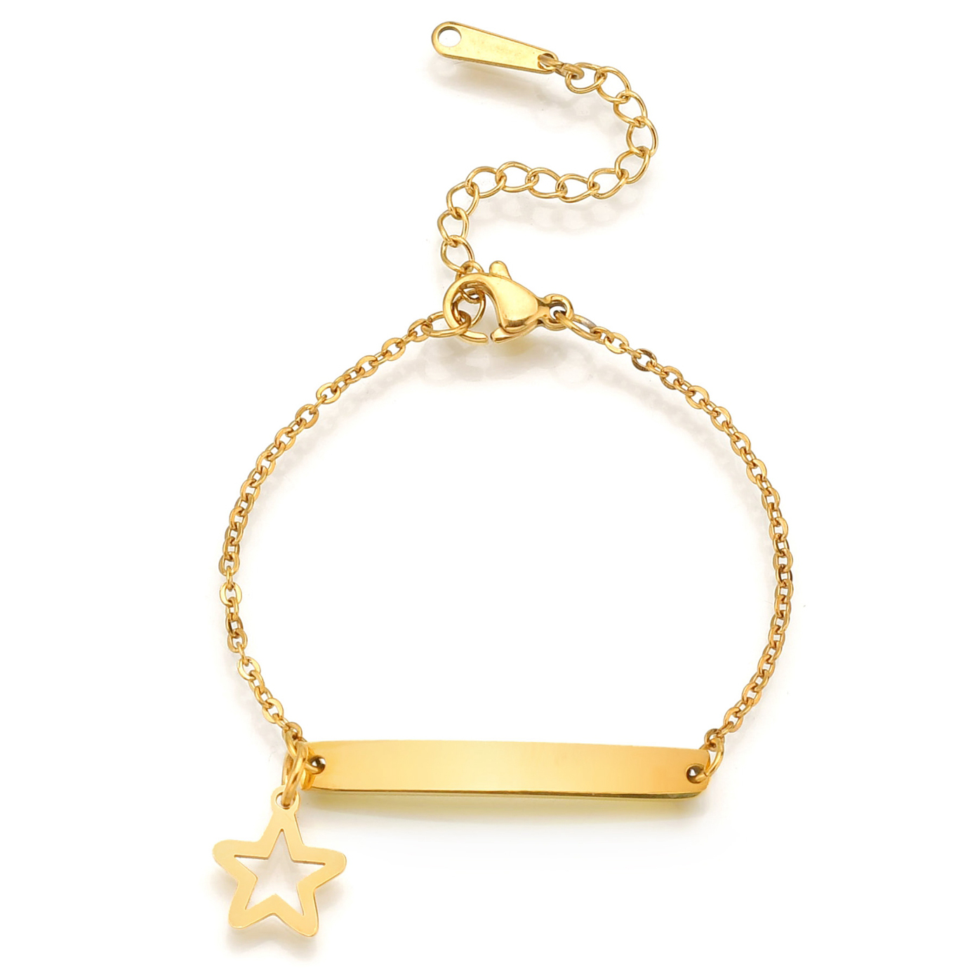 Dit stalen armbandje in prachtig hoogglans goudkleur is verstelbaar van 12 tot 17cm. De schakels hebben een hoogte van 0,25 cm. Het graveerplaatje heeft een afmeting van 3 x 0,4cm en er is ruimte voor maximaal 10 tekens, inclusief spaties. Het sterretje heeft een afmeting van 1 x 1cm. De naam en/of datum wordt in hoge kwaliteit in het graveerplaatje van de armband gegraveerd, u heeft hierbij de keuze uit een sierlijke schrijfletter of een standaard blokletter: