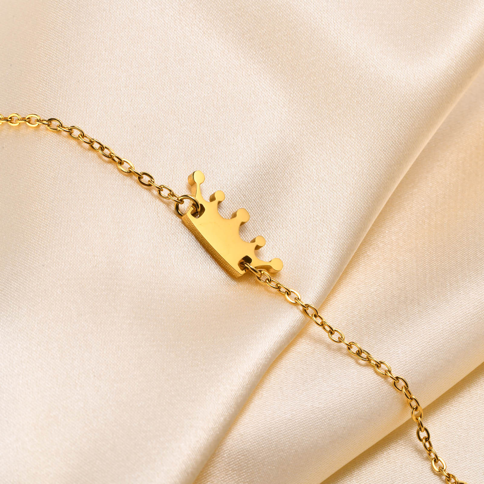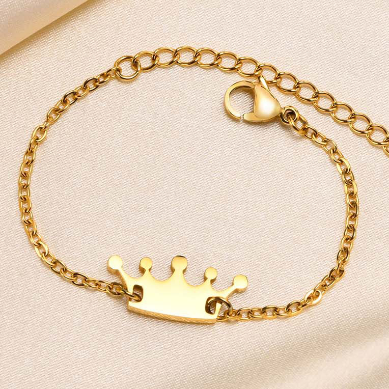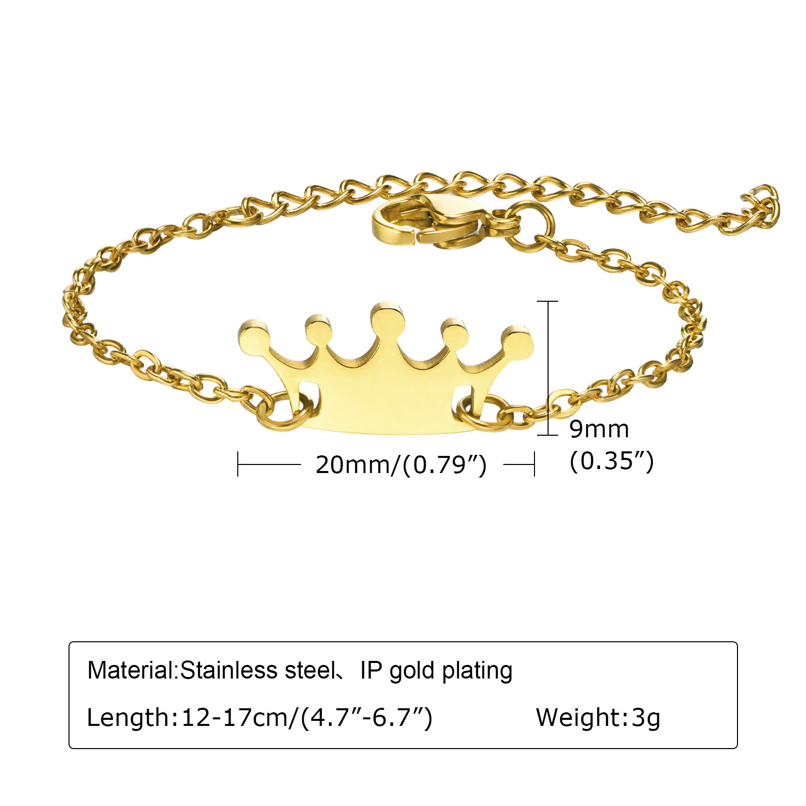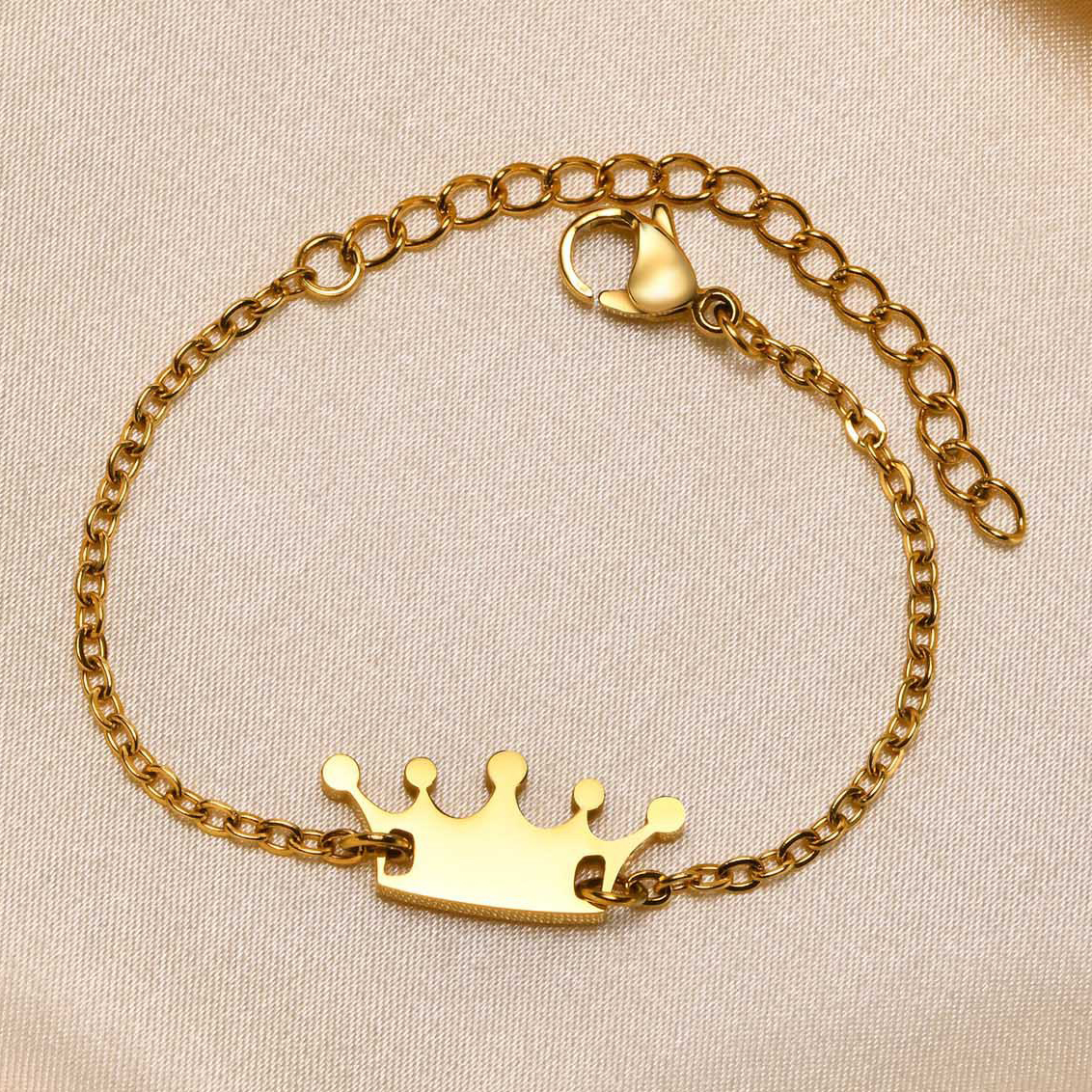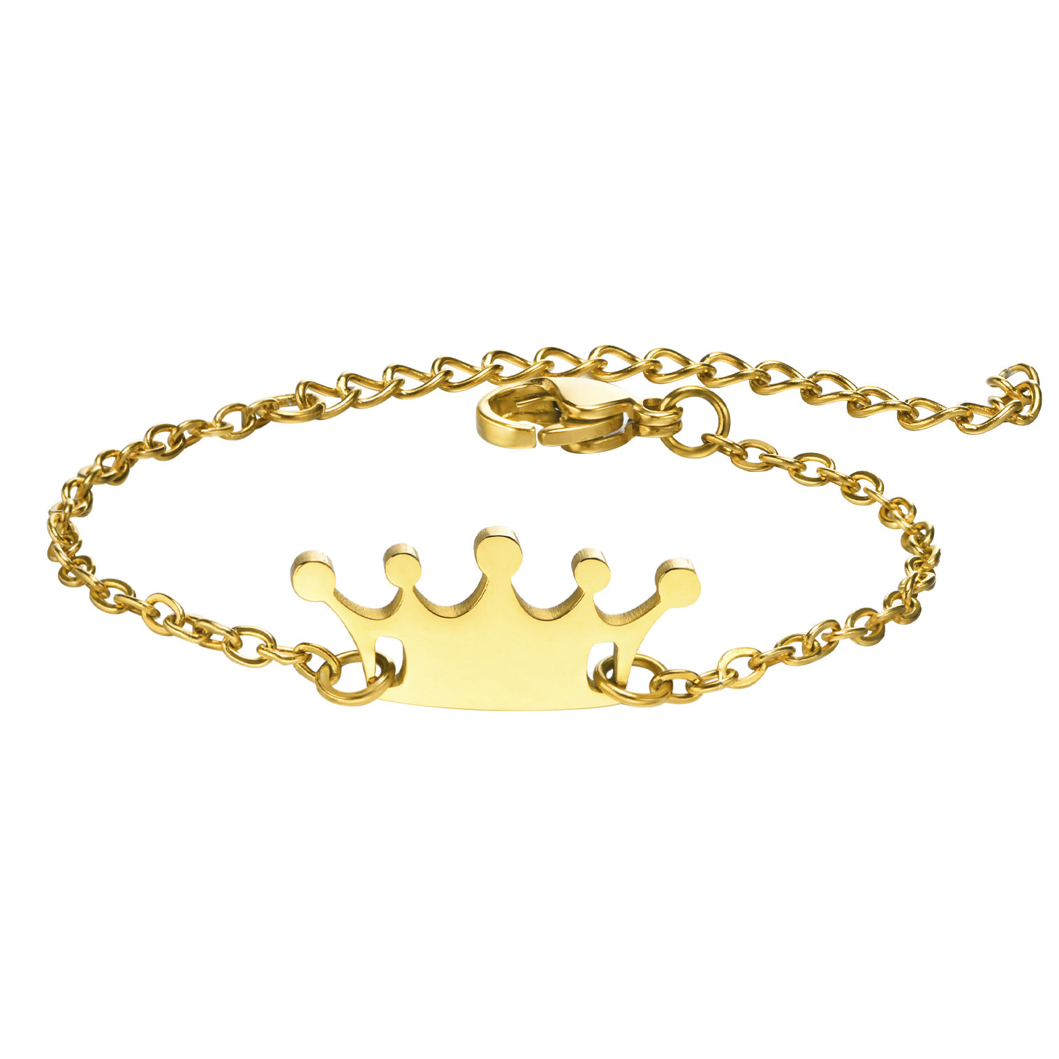 Dit stalen armbandje in prachtig hoogglans goudkleur is verstelbaar van 12 tot 17cm. De schakels hebben een hoogte van 0,20 cm. Het kroontje kan aan de voor- en achterkant gegraveerd worden en heeft een afmeting van 2 x 0,9cm, er is ruimte voor maximaal 12 tekens, inclusief spaties. De naam en/of datum wordt in hoge kwaliteit in het graveerplaatje van de armband gegraveerd, u heeft hierbij de keuze uit een sierlijke schrijfletter of een standaard blokletter: