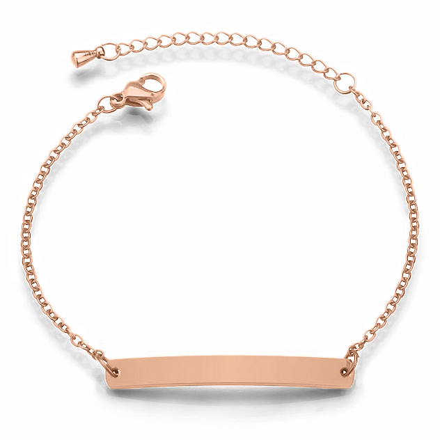 Slank stalen kinderarmbandje inclusief het graveren van een naam en/of datum. Dit kinderarmbandje in prachtig hoogglans rosegoudkleurig en is verstelbaar van 13cm tot 18cm. Het graveerplaatje heeft een afmeting van 30 x 4mm en is voorzien van een slank schakelbandje. De naam en/of datum, van maximaal 20 tekens per zijde, wordt in hoge kwaliteit in het graveerplaatje van de armband gegraveerd, u heeft hierbij de keuze uit een sierlijke schrijfletter of een standaard blokletter:
