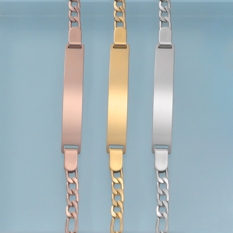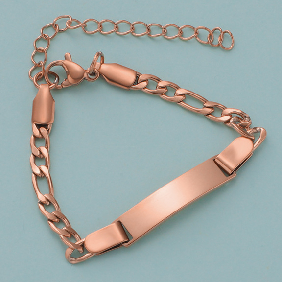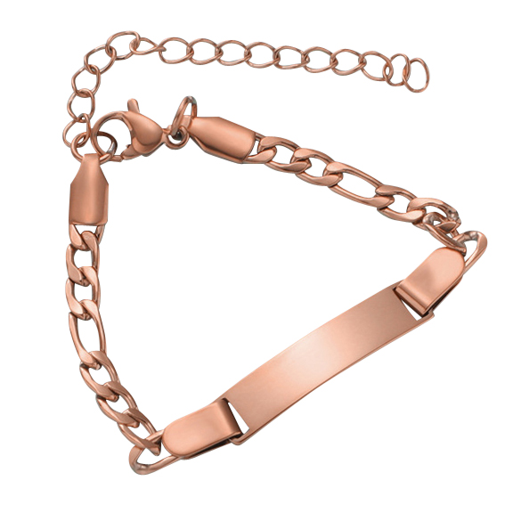 Dit stalen armbandje in prachtig hoogglans roségoudkleur is verstelbaar van 12 tot 15,5cm. De schakels hebben een hoogte van 0,4 cm. Het graveerplaatje kan aan de voor- en achterkant gegraveerd worden en heeft een afmeting van 2,5 x 0,55cm, er is ruimte voor maximaal 12 tekens, inclusief spaties. De naam en/of datum wordt in hoge kwaliteit in het graveerplaatje van de armband gegraveerd, u heeft hierbij de keuze uit een sierlijke schrijfletter of een standaard blokletter: