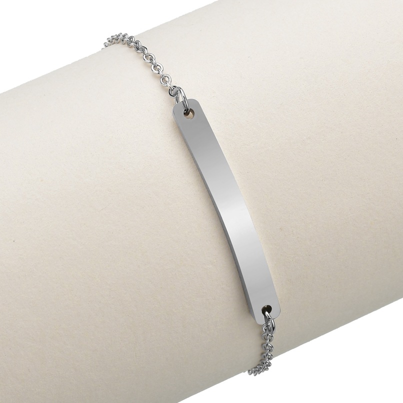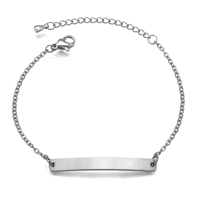 Slank stalen kinderarmbandje inclusief het graveren van een naam en/of datum. Dit kinderarmbandje in prachtig hoogglans zilverkleurig en is verstelbaar van 12cm tot 17.5cm. Het graveerplaatje heeft een afmeting van 30 x 4,4mm en is voorzien van een slank schakelbandje. De naam en/of datum, van maximaal 20 tekens per zijde, wordt in hoge kwaliteit in het graveerplaatje van de armband gegraveerd, u heeft hierbij de keuze uit een sierlijke schrijfletter of een standaard blokletter: