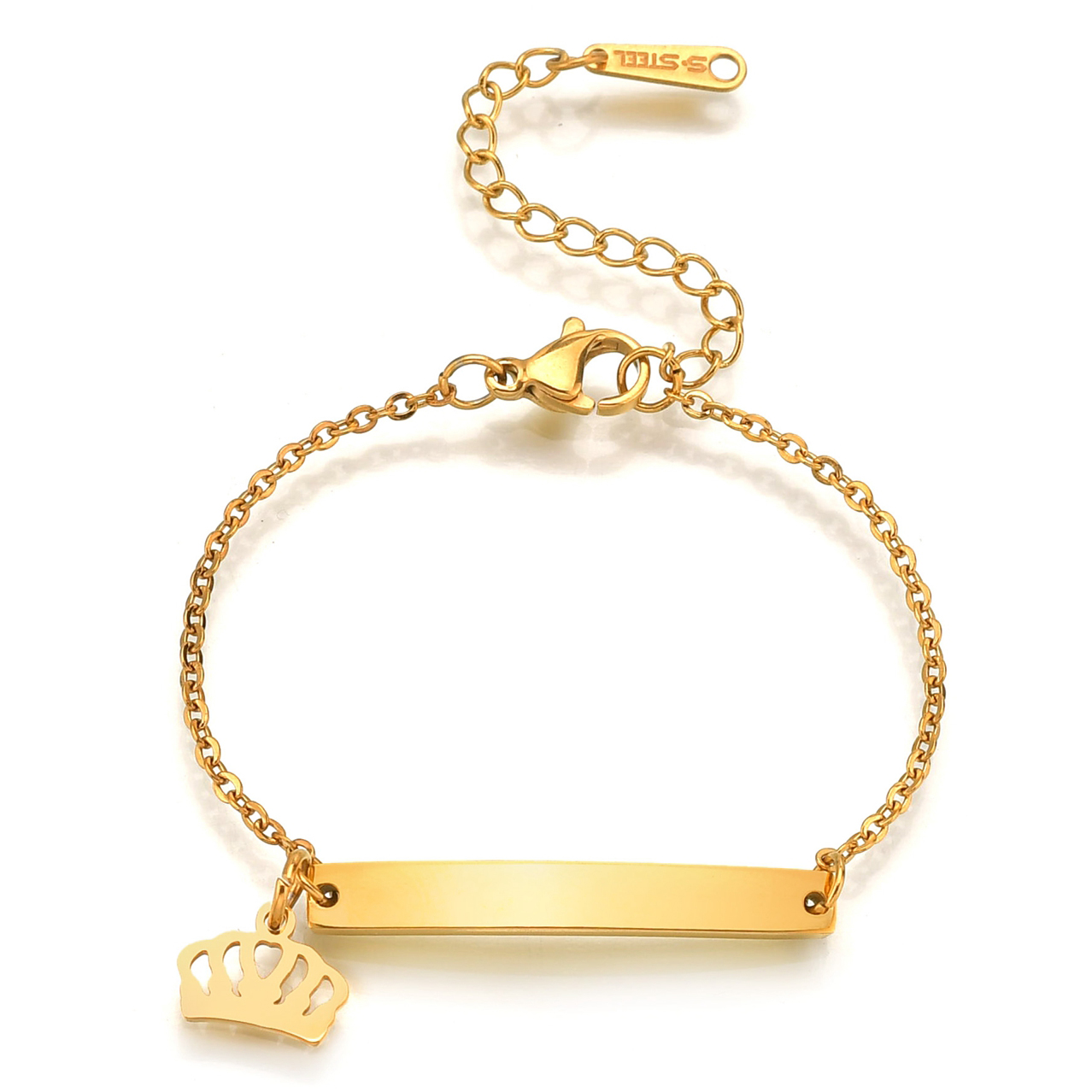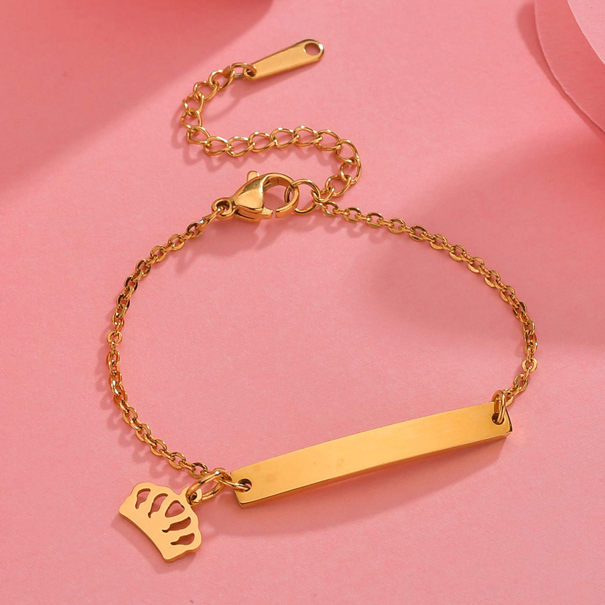 Dit stalen armbandje in prachtig hoogglans goudkleur is verstelbaar van 12 tot 17cm. De schakels hebben een hoogte van 0,15 cm. Het graveerplaatje heeft een afmeting van 3 x 0,4cm en er is ruimte voor maximaal 10 tekens, inclusief spaties. Het kroontje heeft een afmeting van 0,9 x 0,7cm. De naam en/of datum wordt in hoge kwaliteit in het graveerplaatje van de armband gegraveerd, u heeft hierbij de keuze uit een sierlijke schrijfletter of een standaard blokletter: