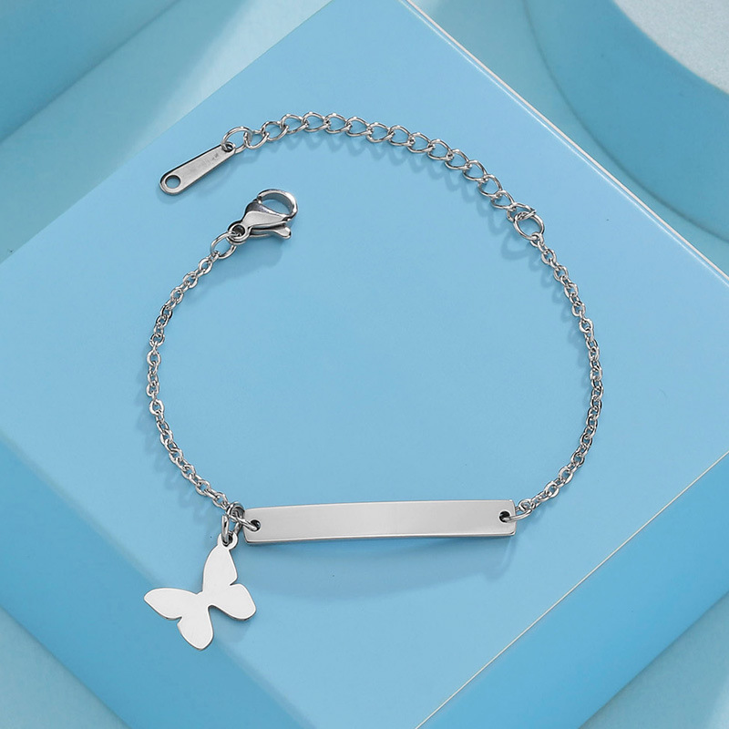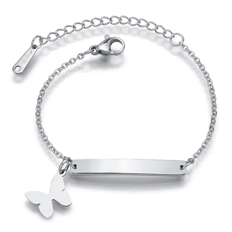 Dit stalen armbandje in prachtig hoogglans zilverkleur is verstelbaar van 12 tot 17cm. De schakels hebben een hoogte van 0,15 cm. Het graveerplaatje heeft een afmeting van 3 x 0,4cm en er is ruimte voor maximaal 10 tekens, inclusief spaties. De vlinder heeft een afmeting van 1 x 1cm. De naam en/of datum wordt in hoge kwaliteit in het graveerplaatje van de armband gegraveerd, u heeft hierbij de keuze uit een sierlijke schrijfletter of een standaard blokletter: