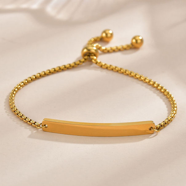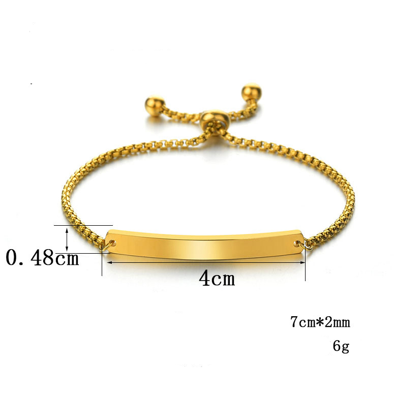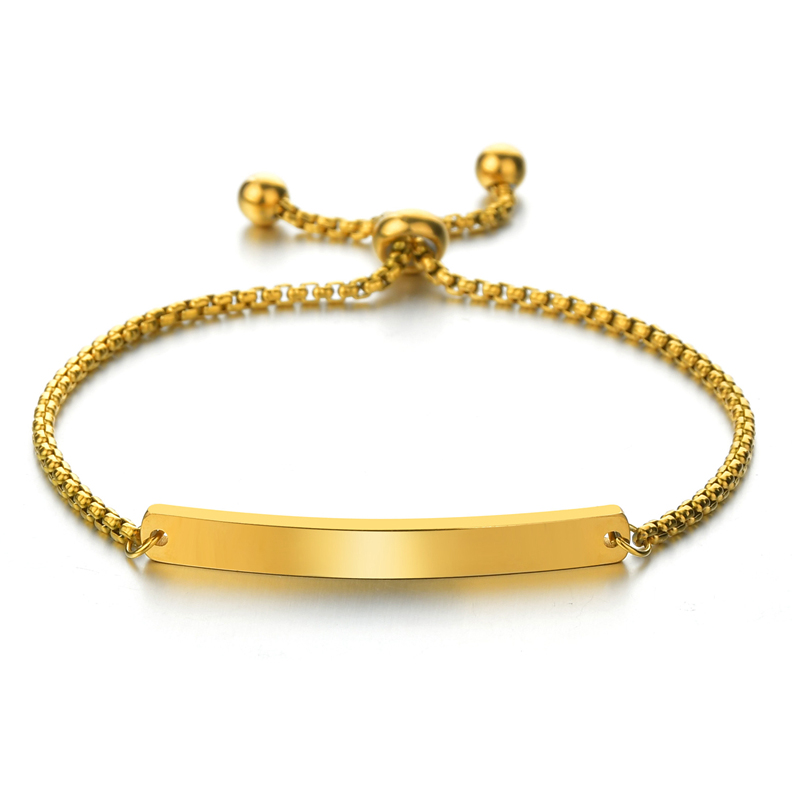 Dit stalen armbandje in prachtig hoogglans goudkleur is verstelbaar tot 17cm. De schakels hebben een hoogte van 0,18 cm. Het graveerplaatje heeft een afmeting van 4 x 0,5cm en er is ruimte voor maximaal 10 tekens, inclusief spaties. De naam en/of datum wordt in hoge kwaliteit in het graveerplaatje van de armband gegraveerd, u heeft hierbij de keuze uit een sierlijke schrijfletter of een standaard blokletter: