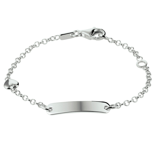 Zilveren kinderarmbandje met een hartje van 5,5x5mm. Op het plaatje kan een naam, datum of tekst van maximaal 12 tekens worden gegraveerd. U heeft hierbij de keuze uit een sierlijke schrijfletter of een standaard blokletter en de voorkant en/of achterkant.
