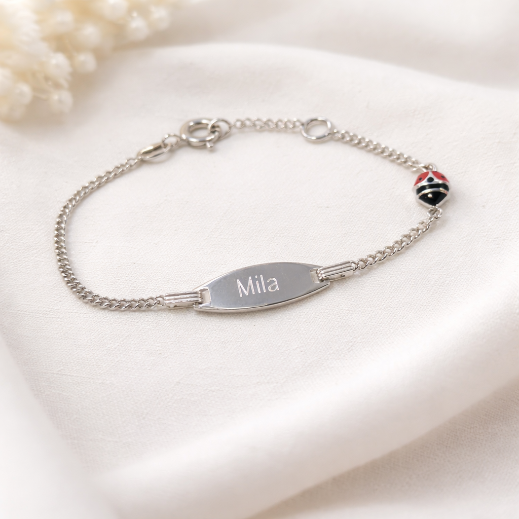 Zilveren kinderarmband met rood lieveheersbeestje ovaal. Op het plaatje kan een tekst naar keuze gegraveerd worden op de voor- en achterzijde. De gravure kan in een sierlijke schrijfletter of een standaard blokletter uitgevoerd worden.