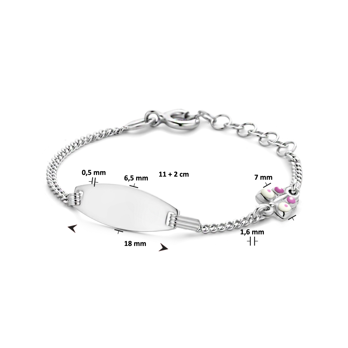 Zilveren kinderarmband met een witte vlinder ovaal. Op het plaatje kan een tekst naar keuze gegraveerd worden op de voor- en achterzijde. De gravure kan in een sierlijke schrijfletter of een standaard blokletter uitgevoerd worden.