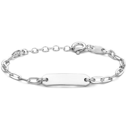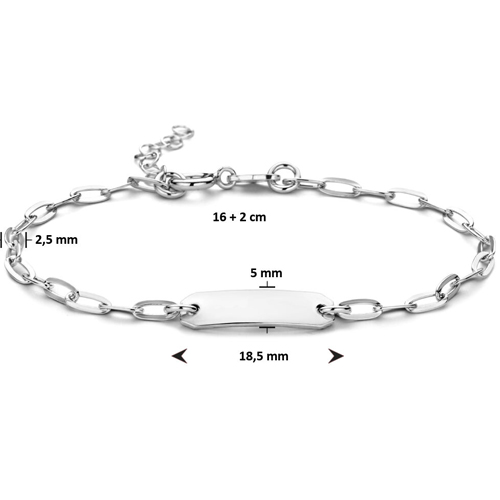 Dit zilver gerhodineerd armbandje is te bestellen in twee verstelbare lengtes van 11-13cm en 16-18cm. Het armbandje heeft een plaatje met een hoogte van 5mm en een dikte van 0.9mm