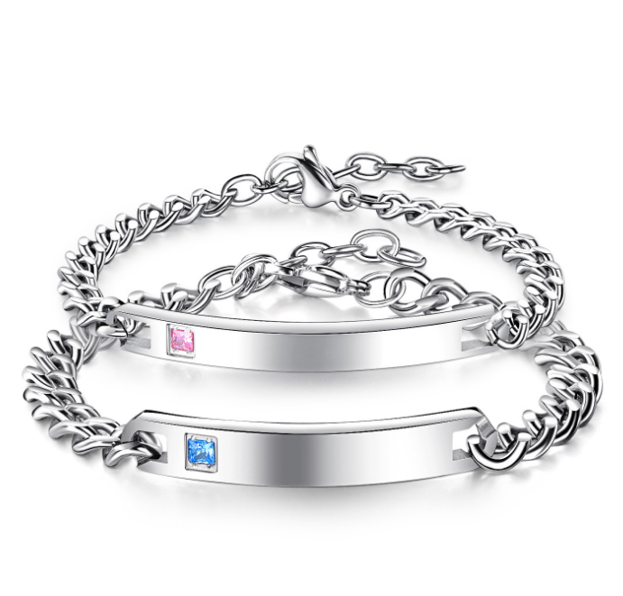 Set van twee hoogglans stalen plaatarmbanden. Deze luxe set bestaat uit één dames plaatarmband met een roze steentje en één heren plaatarmband met een blauw steentje. De prijs is inclusief het graveren van uw eigen tekst. Aan de buitenzijde van de armband kunt u 2 regels van maximaal 15 tekens laten graveren. Aan de binnenzijde kunt u twee regels van maximaal 17 tekens laten graveren. U heeft de keuze uit en standaard blokletter en een sierlijke schrijfletter De tekst voegt u eenvoudig toe in de vervolgstappen.