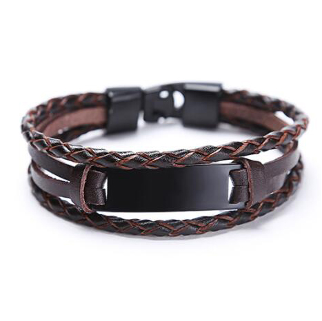 Deze bruin lederen armband heeft drie banden. De middelste banden zijn platte lederen banden met een totale breedte van 10 mm en hier is een zwarte plaat van 4 cm lang en 12 mm breed aan bevestigd. De twee buitenste banden zijn rond gevlochten met elk een breedte van 4 mm. De sluiting en het plaatje zijn beide van RVS en zwartkleurig.