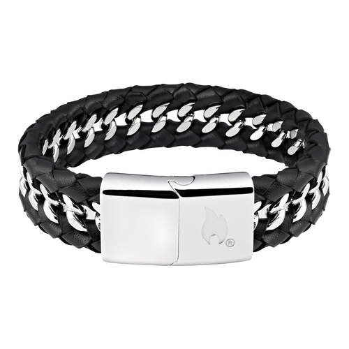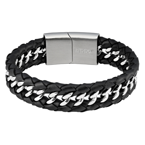 Deze Zippo gevlochten armband leer/staal heeft in het midden een RVS band deze is aan beide kanten vervlochten met een lederen band. De armband heeft een zilverkleurige hoogglans slide clasp sluiting.