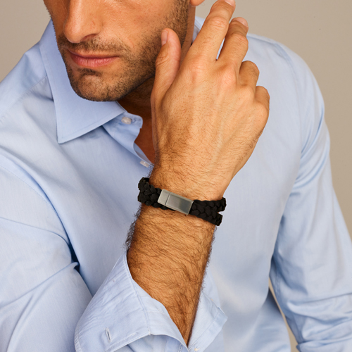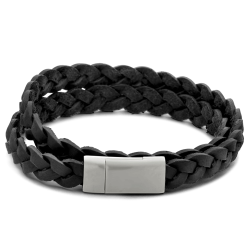 Zwart gevlochten leren armband. Deze stoere armband is 8mm breed en heeft een lengte van 20 cm. Er kan een persoonlijke tekst gegraveerd worden in de buiten- of binnenzijde van de sluiting.
