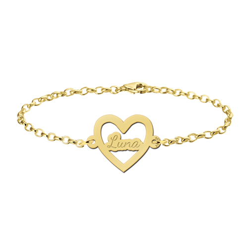 Een fraai 14 karaats gouden armbandje met daaraan een uitgesneden hartje waarop uw naam, of van iemand die u lief heeft gegraveerd wordt met maximaal 8 tekens.