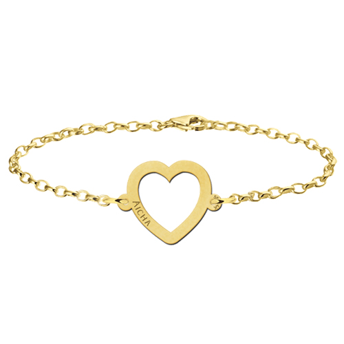Een fraai 14 karaats gouden armbandje met daaraan een uitgesneden hartjes hanger waarop u een naam van iemand die u lief heeft kunt graveren.