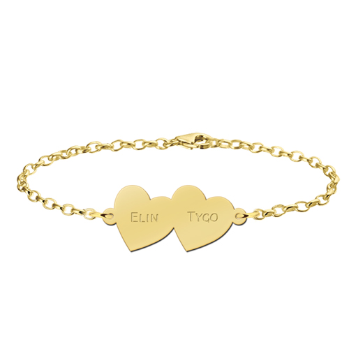 Een fraai 14 karaats gouden armband met daaraan twee schuine hartjes die aan elkaar zitten waarop twee namen gegraveerd kunnen worden van 8 tekens.