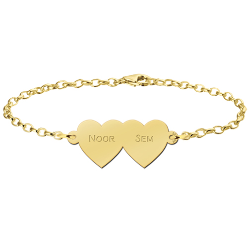 Een fraai 14 karaats gouden armbandje met daaraan twee hartjes waarop twee namen gegraveerd kunnen worden van 8 tekens.