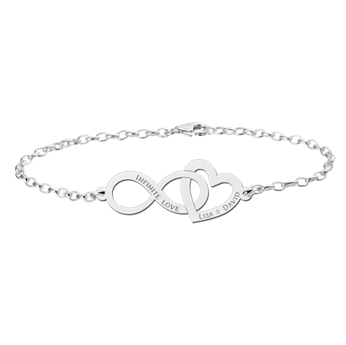 Een fraai zilveren armband met een infinity en hartjes hanger die samen met elkaar verbonden zijn. Dit is de manier om te laten zien dat u de liefde voor altijd met iemand verbindt.