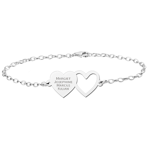 Een fraai zilveren armband met een twee stijlvolle hartjes met daarop 4 namen! Hou uw naasten altijd bij u met deze armband gemaakt van 925 sterling zilver.