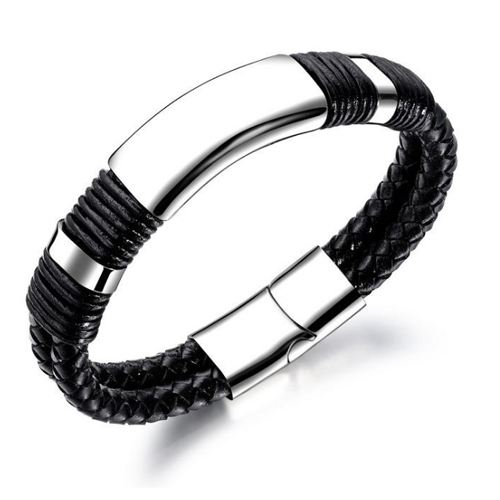 Opvallende armband met twee strak gevlochten leren banden, een metalen plaat en metalen details. De metalen sluiting schuift in elkaar en wordt geborgd met een magneet. De armband is 21cm lang.