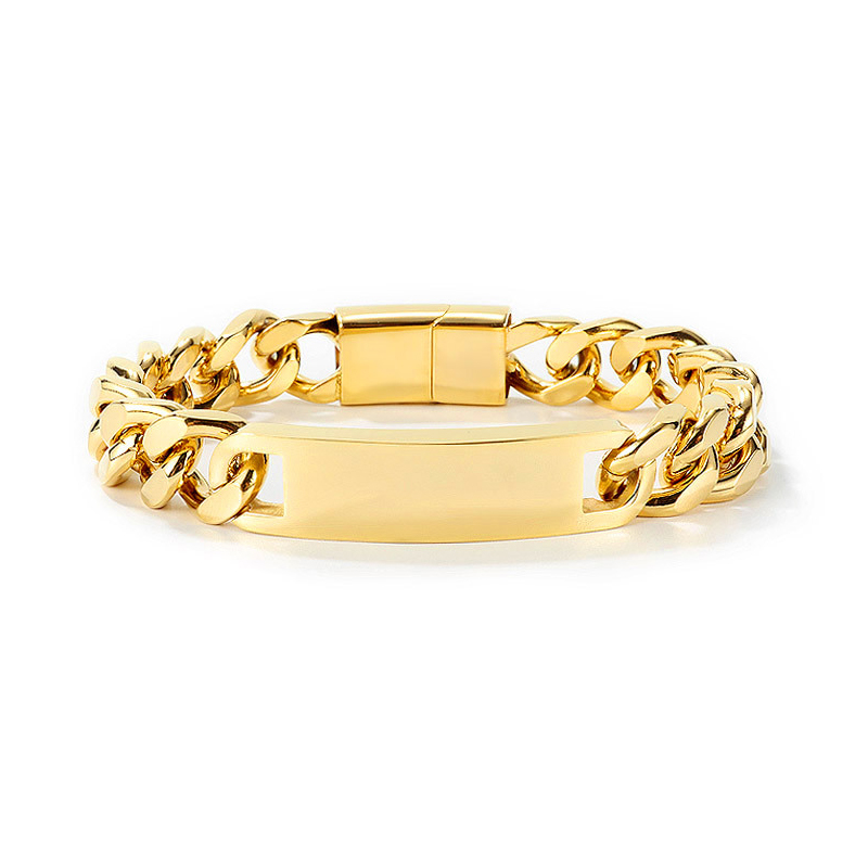 Prachtige RVS plaatarmband met brede schakels. De armband met plaat in goud kleur heeft een stoer voorkomen door de grootte van de schakels. De grootte van de plaat is 5.5 x 1.1 cm. De schakels hebben een breedte van 1,2 cm.