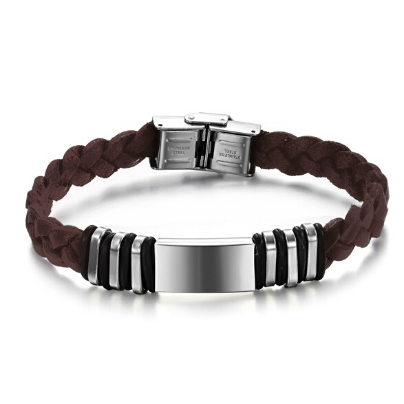 Plaatarmband met een RVS plaat en een gevlochtend bruin lederen band van 11mm breed. De plaat is 21x11,5mm groot. De armband is te bestellen in de lengtes 19,5cm, 18cm en 17cm.