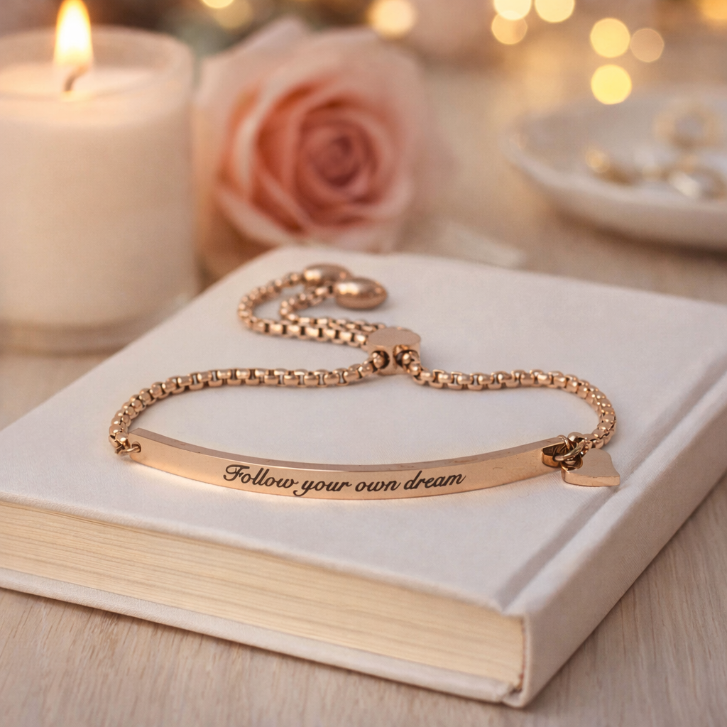 Laat de armband graveren met een tekst die voor jou belangrijk is. Kies voor een sierlijke schrijfletter of een strakke rechte letter. Zowel de voorzijde als de achterzijde van de plaat kunnen worden gegraveerd met maximaal 30 tekens per zijde — ideaal voor een naam, datum of een kleine boodschap met grote betekenis.