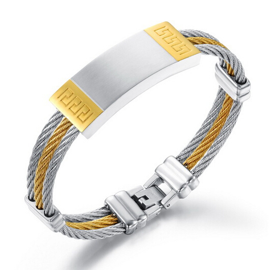 RVS plaatarmband met 3 stoere staalkabels waarvan de middelste staalkabel goudkleurig is. De plaat is 15x41mm groot en de armband heeft een lengte van 18cm. De plaat van de armband heeft een matte afwerking aan de bovenzijde en een hoogglans afwerking aan de zijkanten. De overige RVS delen zijn hoogglans afgewerkt.