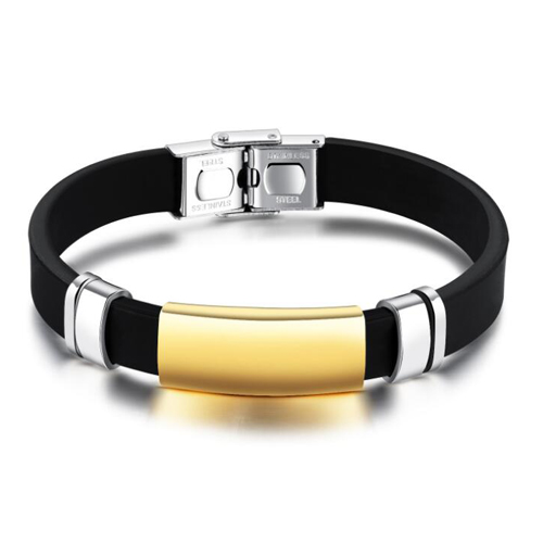 Plaatarmband met een goudkleurige plaat, stalen sluiting en een zwarte rubberen band. De armband is 12mm breed en is te bestellen in diverse lengtes.