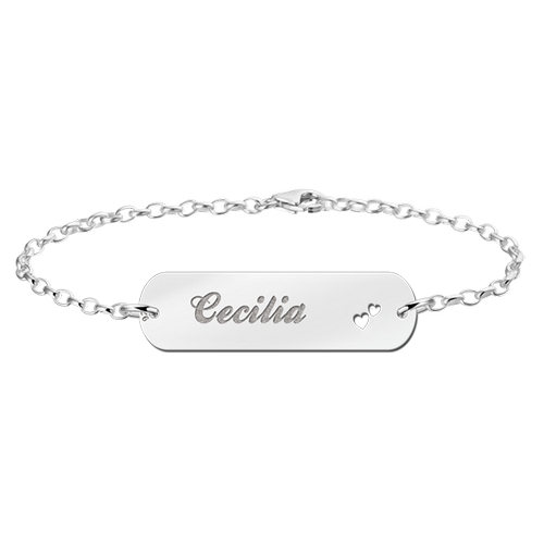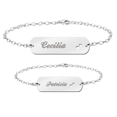 Elke armband is voorzien van een graveerplaatje met twee uitgesneden hartjes. Op de graveerplaat is ruimte voor een naam, datum of korte tekst gravure van maximaal 10 tekens. De tekst wordt gegraveerd in een sierlijk lettertype. Ook kunt u de achterzijde laten graveren op de armbanden. De tekst voegt u gemakkelijk toe in de vervolgstappen.