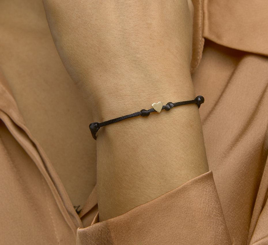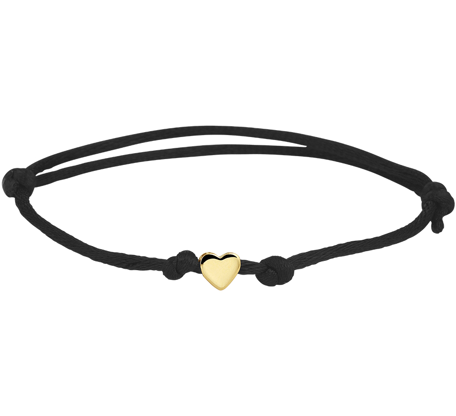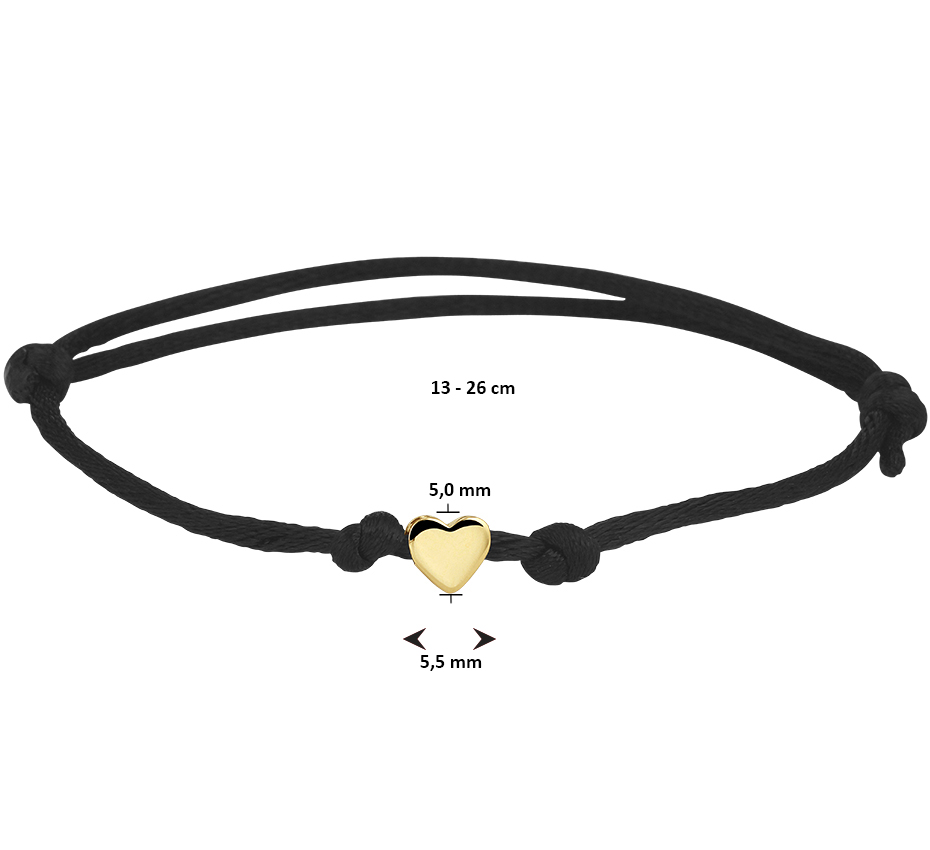 Zwart gevlochten armband met 14 geelgouden hartje waarin een initiaal gegraveerd kan worden. De gravure kan in een sierlijke schrijfletter of een standaard blokletter uitgevoerd worden. Het kan zowel aan de voorzijde als de achterzijde gegraveerd worden. Het armbandje is verstelbaar en heeft draaglengte van 11-19 cm. De afmetingen van het hartje zijn 5x5.5 cm.